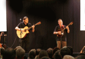 FESTIVAL CONCERTS The Toms' festival concerts are designed for quiet, attentive audiences who have come purely to listen. (They do not typically play free-entry venues, restaurants or noisy bars where people are not going to pay attention - although they may on special occasions). Festival sets typically consist of perhaps 50% original songs (trad-style narrative, strong on melody and emotion) 20% trad songs, 25% trad tunes and 5% original tunes. Both Toms sing (TB takes perhaps 60% of the lead vocals) and their very similar voices create some excellent harmonies. TN takes lead on nearly all the tunes, incuding the TB originals. The Toms have a large enough repertoire to play 3-4 spots without repeating any material, and aim to do so - while also making sure there are a few 'greatest hits' in each concert (so that does usually mean a certain amount of repetition). FESTIVAL PAs, SCHEDULING etc. Please advise where PA is to be used (many festival venues do not need one). For amplification spec and stage layout, click here. The Toms take a pride in making life easy for sound engineers by using on-stage pre-mixing. However, small ajustments to both monitors and main mix will be necessary, so please provide an engineer to mix throughout the show. At low levels monitors will not be necessary, but for halls please provide two monitor mixes (one each) if possible, or just one if that's all you've got. A back-feed of the main out-front mix is not really acceptable. The Toms may ask to use elements of their own PA (e.g. mics) if they are not familiar with your equipment or the monitors do not suit. Please see notes below. PAs of various sizes, with or without sound engineers, are available upon request. SOUND CHECKS The Toms may use up to 12 instruments (unless requested otherwise), so cannot risk playing amplified concerts without a proper sound-check (a minimum of 10 mins on stage). This really needs to be before the start of the concert, if at all possible, not between acts. Whenever any multi-instumental combo is required to use a PA without a full, private, sound check, the first number - which is the most important - is likely to be spoiled by signals to the crew and other problems on stage. And this will continue with every instrument change throughout the concert. The gig is less likely to be a success from the audience or the performers point of view. SCHEDULING The Toms are known for using a variety of instruments, songs/tunes, styles and deliveries in every spot - and that's usually what Festvials want. To achieve a focused show - as normally expected by their audiences - they therefore do prefer to play fewer, longer sets, if possible, rather than more, shorter spots. Festival sets of less than 30-40 minutes do not really permit a happy balance between production time/effort (unpacking/packing, getting on and off stage, tuning, line checks etc.) and performance. However, The Toms are willing to do them if necessary. Please always allocate a 20 minute slot in your schedule for all first sound checks in each amplified venue, to allow for unpacking, tuning etc. The Toms have frequently had sound checks scheduled by festivals at the same time as performances elsewhere, or with insufficient time to move venues. This does make life hard, and can impact on the quality of the performance! Also, if possible, please do not schedule work in another, different venue, between a sound check and a performance without prior discussion. This is because the process of packing, moving, unpacking, playing, re-packing, coming back, unpacking again and setting up, may defeat the point of the sound check. The Toms also prefer to be in the audience throughout the concert before their slot if possible, so they'll be tuned in to the mood of the event, can pick up on any running gags, and can avoid duplicating any material played by other acts. They also need time for their instruments to acclimatise to the room temperature properly. TRAVEL TIME After the concert please make sure that they have sufficient time to pack their instruments, get to the next event, unpack, and sound check if required. If the journey's on foot they may need to make THREE TRIPS EACH. (They have to carry at least 6 guitar-sized cases, 4 or more large briefcase-sized cases, and 2 or more large long stand bags). PARKING If they need to travel by van, they will need to be able to park close to both venues. Please reserve spaces if possible, or warn us in advance if there's a potential problem, so we can research alternatives. WORKSHOPS Both Toms are experienced workshop leaders TOM NAPPER's festival workshops concentrate on tunes and tune playing - mainly for tenor banjo, tenor guitar and the mandolin family. (Please make sure your programme warns people which instruments are most suitable. Other instrumentalists are welcomed, but may not get as much from the workshop). Tom also tutors individuals and classes around West Yorkshire, including special needs and other groups. TOM BLISS uses his experience as a scriptwriting lecturer in his narrative SONGWRITING workshops. He also offers workshops on GUITAR (beginner and intermediate; various tunings plus classical, folk rock and fingerstyle techniques), ACCOMPANIMENTS + ARRANGEMENTS for original and traditional songs and/or tunes (any instrument), STAGE CRAFT/PA and MARKETING FOR MUSICIANS. See TB's solo/festival page for more info. TOM NAPPER TOM BLISS together also provide workshops on arranging tunes and/or songs, "Rearranging The Tradition" stage-craft, working as a duo, meet-the-artist etc. Suitable for schools and other groups. SESSIONS/SINGAROUNDS/COMPERING Sessions led by TOM NAPPER are well attended and rewarding for players and listeners alike. TOM BLISS is happy to manage singarounds, or carry out MCing duties if required. SAMPLE COPY FOR PROGRAMMES (Copy+paste or rewrite as required!!) "Tom Napper (vocal, tenor banjo, mandolin and octave mandolin) Tom Bliss (vocal, guitar, mandocel
